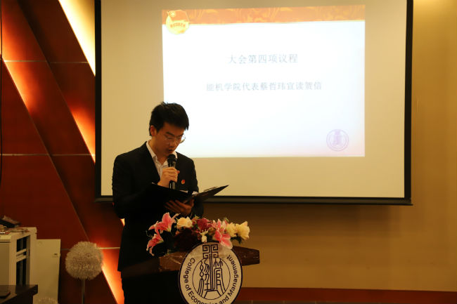 18:00,大会首先进行了预备会议。英国上市公司官网365分团委副书记李彦雯,分团委副书记助理赵倩雯,英国上市公司官网365学生会副主席严思奇、胡培露分别向大会宣读了《经济与管理学第三次团学代表大会筹备工作报告》、《英国上市公司官网365第三次团学代表大会代表资格审查报告》、《英国上市公司官网365第三次团学代表大会主席团、秘书长、副秘书长名单》、《英国上市公司官网365第三次团学代表大会总监票人、监票人、总计票人、计票人名单》、《经济与管理学第三次团学代表大会选举办法》和《英国上市公司官网365第三次团学代表大会正式会议议程》,全体代表听取、审议并通过。