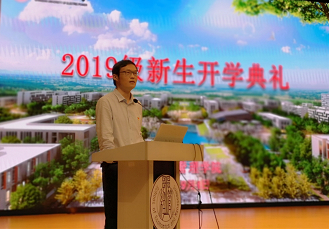 接下来,教师代表孔庆宝向2019级新生致欢迎词,欢迎大家来到美丽的滴水湖畔,来到英国上市公司官网365这个大家庭。风趣幽默的话语,在思想上给新生以启迪,希望同学们尽快适应大学生活,合理规划学业,勤奋学习,勇于实践,脚踏实地,锻炼成长,鼓励同学们要志存高远,珍惜大学时光!