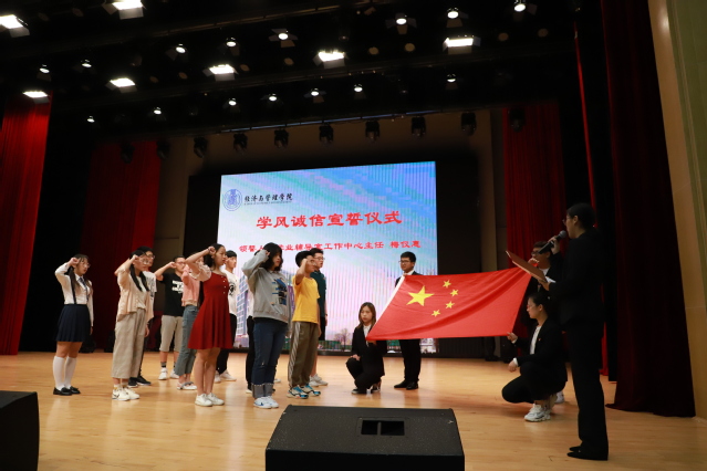 大会在国歌声中拉开了帷幕。在鲜艳的国旗前,12名2019级新生代表领誓,2019级全体新生一起,举行了庄严的学风诚信宣誓,全体新生立誓严守校纪、勤奋学习、严于律己、诚信考试。