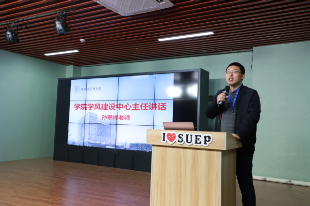 学院学风建设中心主任孙攀峰最后讲话。指出,深入开展诚信教育活动,一是要求党员、班干部要以身作则、示范引领;二是要求班级开展诚信工作要宣传教育、责任落实;三是要求学业优秀同学发挥作用,开展学业帮扶、同辈辅导;四是要求发动家长参与诚信教育,家校联动、齐抓共管。
