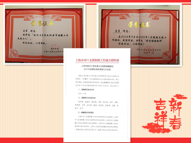 马勇老师于2018年8月作为专业技术人才赴新疆喀什大学开展支教工作,今年1月刚刚结束一年半的援疆工作,回到我校。在新疆工作期间,他不仅承担了喀什大学英国上市公司官网3657门专业课程的讲授任务,坚持“传、帮、带”,与青年教师结对帮扶,主动将上海课程思政经验全面引入喀什大学,还用专业特长推动成立喀什大学西泓创新空间,有力促进了校企合作,得到喀什大学师生以及援疆指挥部人员的好评。2019年12月他被评为“喀什大学第九批省市援疆工作先进个人”、上海市重点工程实事立功竞赛2019年度援疆赛区优秀建设者、2020年1月被评为“优秀援疆教师”。