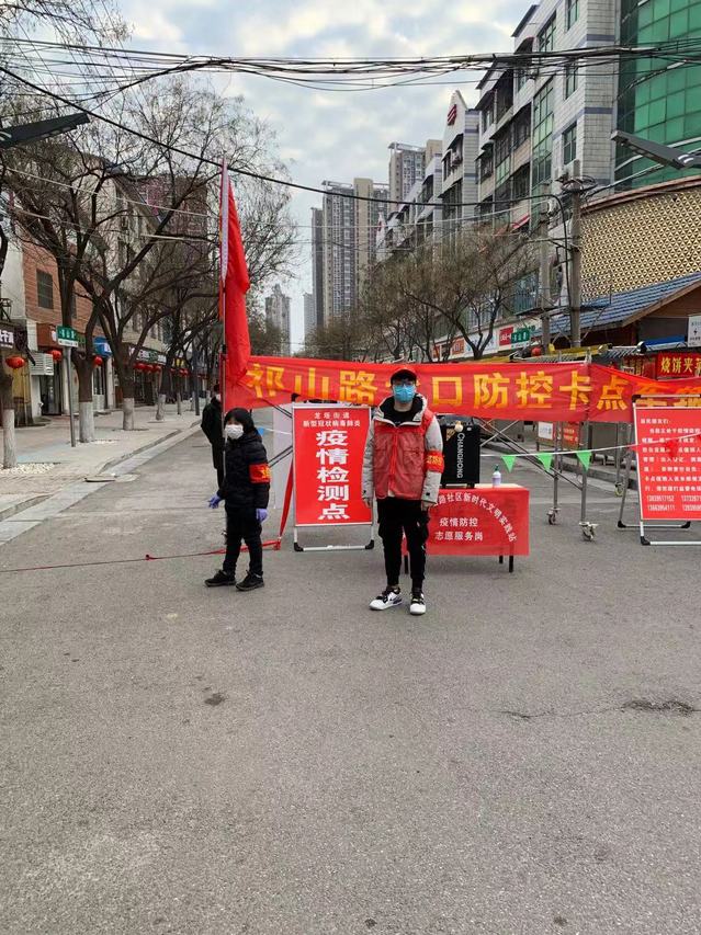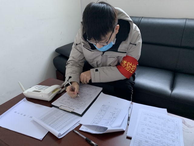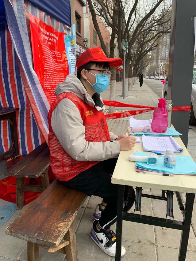 在志愿者工作期间,段然同学先后和社区志愿者通过电话询问、张贴宣传材料、发布微信群信息、小喇叭等多种形式开展疫情防控工作。他从早上来到社区办公室,穿好志愿者服装、戴好红袖章、做好自身防护措施以后就开始了一整天的工作,上午到小区物业挨家挨户给居民打电话,询问是否到过外省;下午到卡口为进出的人员进行登记、测体温,并对出门未配戴口罩的市民宣讲疫情防控知识,劝导过往群众少出门、不聚集、勤洗手、戴口罩,做好防护措施。
