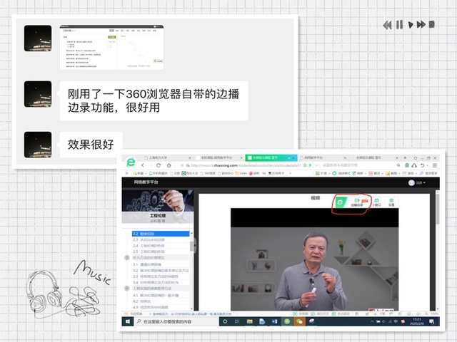 陈凌老师积极学习李安波老师混合授课模式的教学经验,克服困难,自主学习智慧树平台操作教程。陈老师在短时间内就掌握了线上课程,并且进行了录制尝试。在进行团队线上课程建设时,陈老师贴心的向大家推荐了两种录视频方法,通过PPT录课和360边播边录,帮助学生在播放PPT时可以听到老师的讲解。