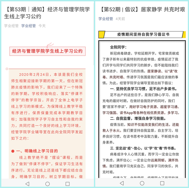 学院的思政育人始终坚持“立德树人”全员全方位育人的大格局。在线上教学准备期间,英国上市公司官网365率先发动学工队伍把“育人为本”、“关爱为主”的理念始终贯穿在思政育人的全过程。通过拟定《英国上市公司官网365线上学习公约》的形式,规范同学们的线上学习习惯。通过积极关心和帮助网课困难学生,校院共同发力,以多种方式解决学生困难。通过“下沉”线上班级,协助教学条线建立三级线上教学管理体系,协助落实“一课一班一群”工作机制。通过线上班会,主动讲解线上教学的工作安排和要求,安排信息员在QQ群、微信群里做好线上动态调研,及时提醒同学们提前预习、及时考勤、线上打卡、到课率每日一报等基本工作。通过学业辅导室设计发放了《英国上市公司官网365学生在线学习情况调研》,围绕学生线上学习的困难、学习方式的偏向性与需要的支持三个方面开展调查研究,为后期制定有效的学习帮促措施提供科学依据。通过学工队伍的周密安排积极推动,逐步完善了学工队伍、专业教师与学生干部多维联动体系,共同推动学生养成线上自主学习的良好习惯。
