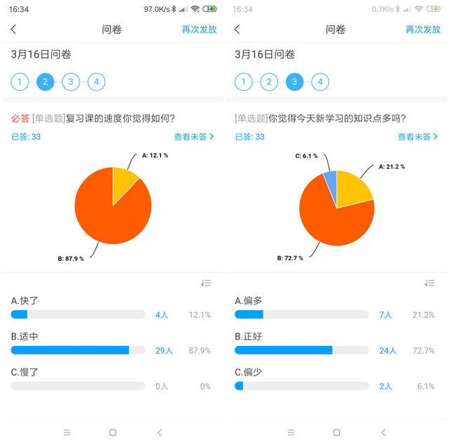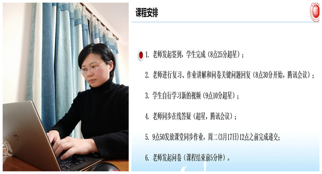 有部分同学反映自己不能做好线上学习的时间规划,并且对于每堂课的内容容量每位同学都有不一样的看法。针对以上问题,孙波老师根据自己所授专业课程特点,将课程的学习拆分成具体的时间段,并发布在课程的PPT资料中,帮助同学们能够更好地管理和把握自己的课程学习时间。同时,孙老师在课程结束后在平台上设置相关的问卷调查。根据同学们学情的反馈,孙老师及时调整下次课的教学重点内容,以满足绝大部分同学的学习需求。
