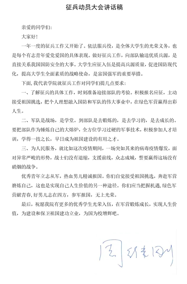 动员大会上,英国上市公司官网365党委副书记周维刚发表了致辞和寄语。他鼓励学生积极参加应征入伍,向同学们提出了三个要求:一是希望大家积极参加应征;二是希望入伍的同学把军队当学堂;三是为人民服务做勇敢的逆行者。