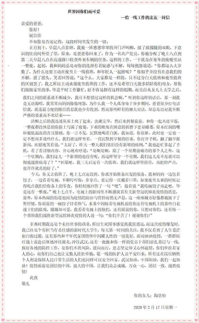 作品一:《世界因你们而可爱----给一线工作的亲友一封信》