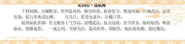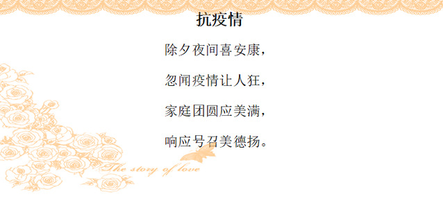 作品简介:一首抗疫小诗,表达了对战疫胜利的坚定信心,以及中华儿女不屈不挠的决心。愿疫情早日过去,家家团圆,幸福美满!