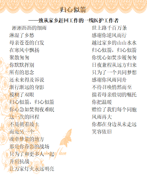 作品简介:通过诗歌描写了春假休假返回老家的医生们在疫情期间主动重返医院、为抗击新冠肺炎作出贡献的场景,表达了对医护人员们崇高的敬意。