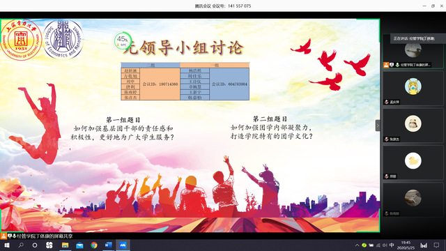 4月26日17点,“经”英培育大赛于线上拉开帷幕,学院团委书记李玲丽老师、团委副书记王卲萱老师以及书记班子、主席团的六位成员出席此次活动并担任本次大赛评委。参与此次比赛的是来自学院18、19级的50名骨干成员,通过三分钟PPT自我展示与提问互动,展现了选手们出色的应变能力、良好的理论基础、以及良好的语言表达能力,最终通过激烈竞争,选拔出36名选手进入复赛环节。