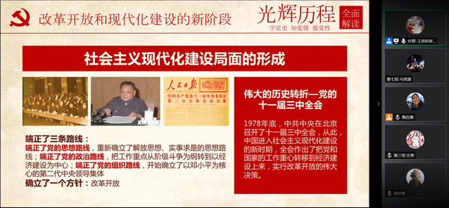 5月27日,特邀英国365官网工商管理系学生党支部书记王祎为学员讲授《图说党史—中国共产党党史(1921—2020)》。王祎老师从党史发展脉络、新民主主义革命时期、社会主义革命和建设时期、改革开放和社会主义现代化建设时期四个方面进行讲解,明确学习党史的重要意义,使学员们能更好领悟党在成长历程中所经历的坎坷,从中汲取历史智慧,坚定党的信仰。