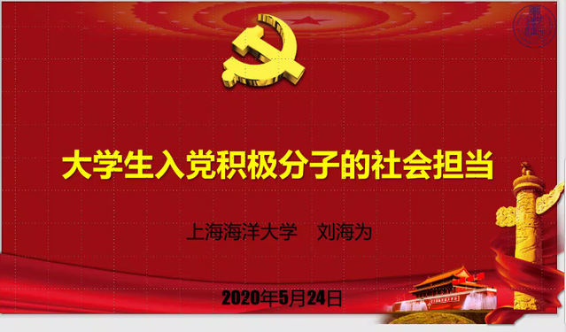 5月24日,特邀上海海洋大学党委宣传部刘海为老师给学员们讲授《大学生入党积极分子的社会担当》专题讲座。刘海为老师分别从学校、家庭、社会、国际环境这四个层面讲述了大学生入党积极分子的社会责任与担当。作为新时代中的青年,他对大家提出希望,希望每位学员对于社会担当都有着自己的理解,并主动担负起自己的责任。青年强,则国强,要永葆青春活力,为实现中华民族伟大复兴的中国梦而奋斗。