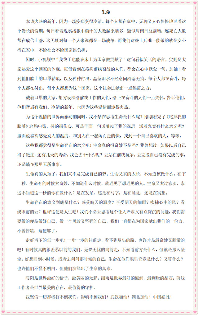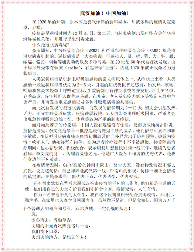 作品简介:文章用记叙的方式回顾了疫情发生后各方的行动,平凡的言语却道出了在疫情来时人类面对不知情的病毒时表现出的勇敢和顽强的精神。