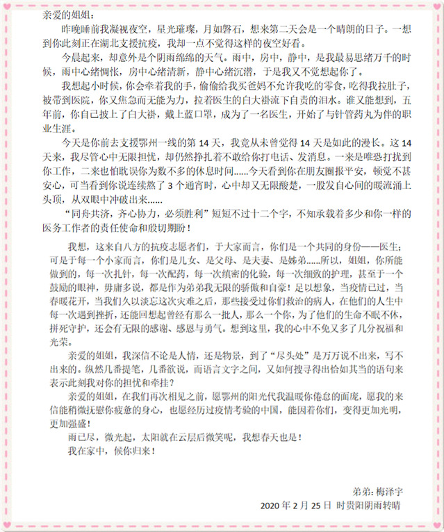 作品简介:一个弟弟写给支援湖北的姐姐的一封家书,一声声呼唤,感人至深。愿所有逆行者,平安回家!