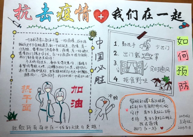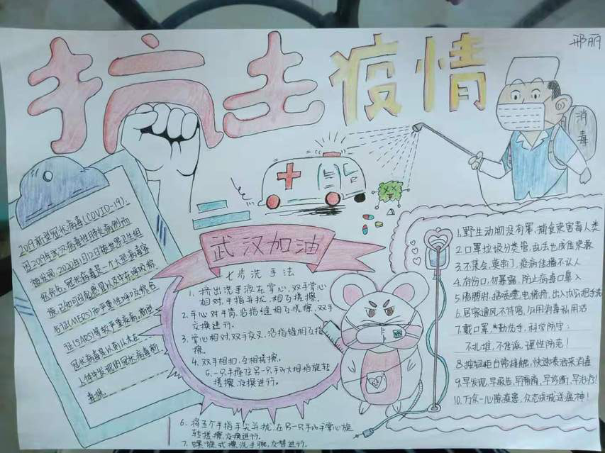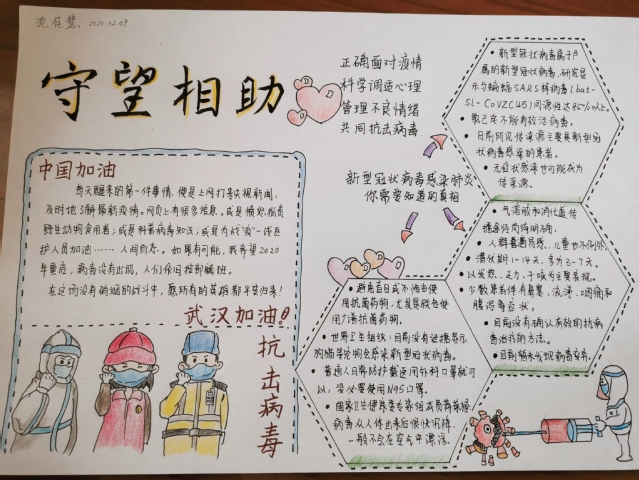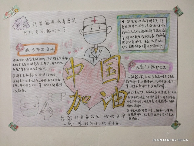 作品简介:怀着对疫情的担忧,坐在家中的我想着出一份手抄报。在这次疫情中,我看到很多努力付出的身影,最要赞扬的是奋斗在一线的医护人员,你们辛苦了!作为大众的我们会认真配合,做好防护工作,为你们默默加油,为中国加油!