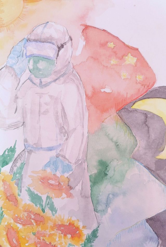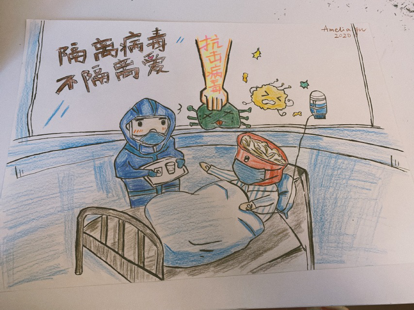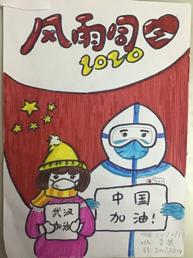作品简介:这个作品是以在我身边观察到的志愿者以及结合2020鼠年和医护工作的特点画成的,拳头则表达了我对抗击这次疫情的决心和信心,虽然都是简单的文字,但也恰恰是普通的我们力所能及可以做到的。希望通过这一点点的色彩给武汉医护人员带来一点温暖,我们在武汉人民身边!