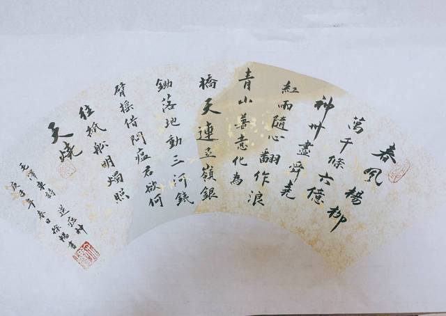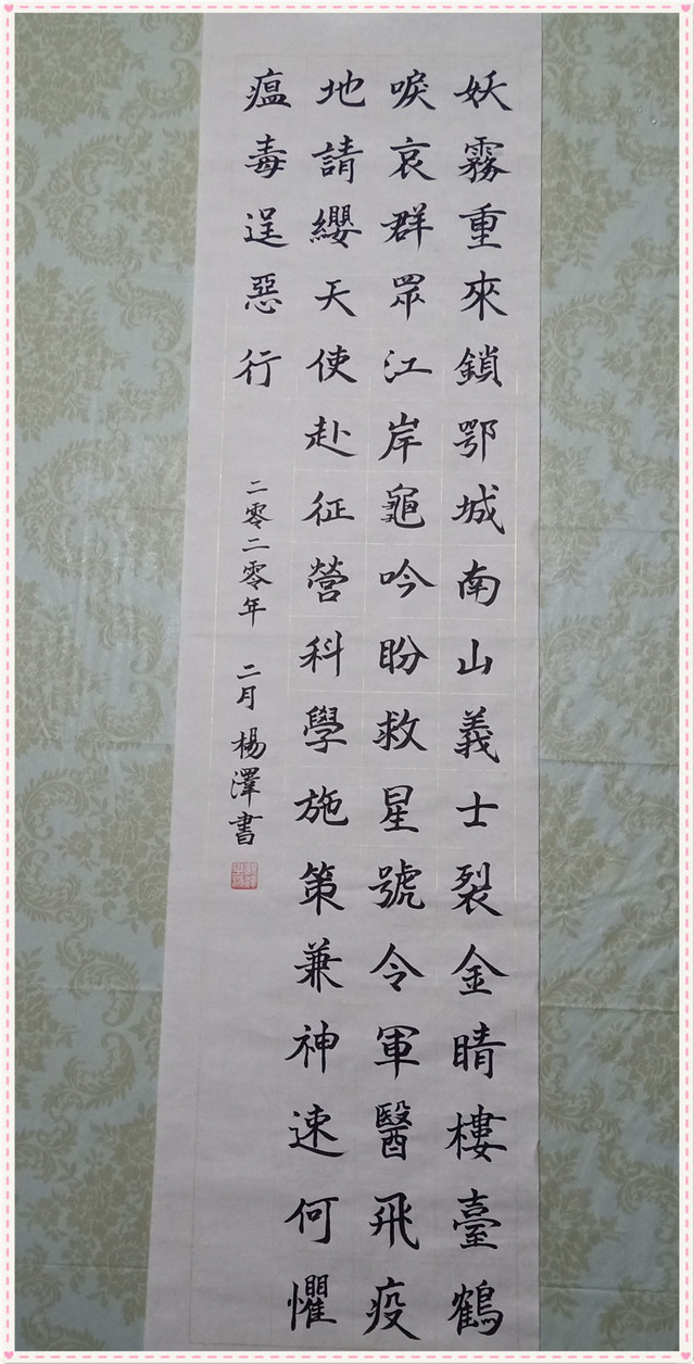 作品简介:2020年春节之时,本应该是家家户户沉浸在与家人团聚的喜悦和幸福的时候,一场突如其来的灾难却悄然来临……新冠肺炎疫情牵动着每一个中国人的心。我写下这幅书法作品,内容来源于毛主席的诗词《七律二首·送瘟神》,是毛主席在1958年6月30日从《人民日报》得知余江县消灭了血吸虫后写下的七言律诗,其意在于歌颂人民群众英勇奋战,抵御病毒,并希望“瘟神”病毒早日消失,人民恢复正常生活。此次疫情爆发后,有一群“逆行者”,就是奋战在抗击新病毒疫情一线的广大医护人员和基层排查工作者们……他们不惧牺牲,坚持奋战在疫情第一线。希望全国能在春暖花开之时,恢复昔日繁华,武汉加油,中国加油。