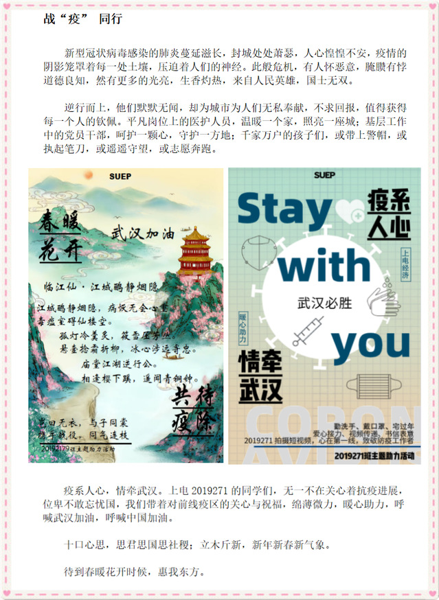 面对抗击疫情这场全国人民的战斗,英国上市公司官网365学子创作出了种类丰富、形式多样的网络文艺作品。色彩鲜明的海报,设计巧妙的剪纸,鼓舞人心的抗疫微视频,无一不在传递着青春正能量,赞颂着逆行者们的大爱与奉献。