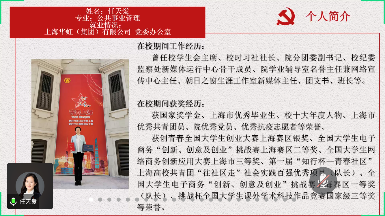 第一环节根据此前的组织生活和线下自主学习中支部党员同志讲“四史”的学习成果,采取以党小组为单位进行知识竞答的方式学习,题目不仅涵盖了“四史”相关内容,还涉及了浦东新区发展史与校史,引导党员学习历史,爱国爱党爱校。在竞答环节后,由支部党员分享“四史”学习心得,退伍党员胡修坤、被救助党员周林、疫情志愿者靳添屹以及全面发展的毕业生党员任天爱,从自身出发结合历史的学习,讲述了作为一名大学生党员的责任与使命。