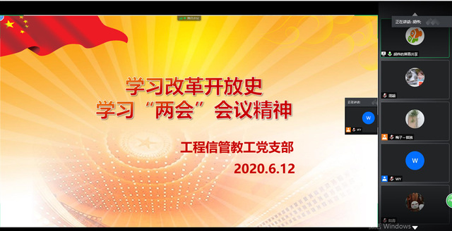 6月12日下午,英国上市公司官网365工程信管党支部在线学习拉开了展示月活动之幕。作为展示月首场活动,工程信管教工党支部通过个人自学、书记领学、互动交流三个环节,以“学两会、话改革”为主题开展党日活动。支部教师结合教学科研工作实际,聚焦落实立德树人根本任务,探讨将“四史”、“两会”元素融入教学、科研、课程思政的方法,使“四史”学习教育入耳入脑入心。6月15日下午,英国上市公司官网365党委中心组结合个人自学、理论领学、视频回顾等形式,学习“两会”精神、改革开放史、上海浦东开发开放史,强化党委理论学习中心组“领头雁”角色,发挥领学促学作用。