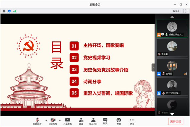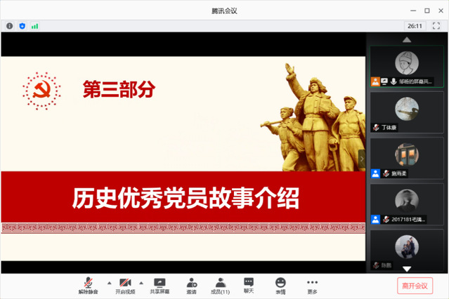 本次会议共分为五个部分:国歌奏唱;党史学习;历史优秀党员故事介绍;诗词分享;重温入党誓词。会议在高昂的国歌声中拉开序幕。今年是中国共产党成立99周年,也是全面建成小康社会的收官之年,预备党员施雨柔同志结合学习视频带领大家回顾了中国共产党的伟大历程,这是中国历史上“开天辟地的大事变”,自从有了中国共产党,中国革命的面貌就焕然一新。回顾党的发展历程,展现了党的伟大,更加坚定了支部成员的理想信念,要坚持党的领导,不忘初心,牢记使命,为共产主义事业奋斗终生。