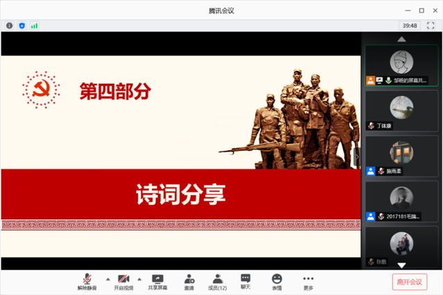 邹杨、施雨柔、陈倩倩、丁体康四位同志和发展对象岑琼沁同学依次向大家分享了陈毅的《梅岭三章》和毛泽东的《念奴娇·井冈山》、《卜算子·咏梅》、《七律·长征》、以及《西江月·井冈山》五首诗词,介绍了五首诗词的创作背景,深入领悟了诗词所蕴含的意义。五首诗词分别展现了中国共产党发展历程中的不同片段,诗词中所共同蕴含的爱国主义精神、革命乐观主义精神和中国共产党人的大无畏精神是中华民族宝贵的精神财富,也是共产党员努力的方向。做合格党员,就要在历史中汲取先进经验,以史为鉴,与时俱进,学习中国共产党从艰苦奋斗中形成的优良作风和大无畏精神,乘风破浪,砥砺前行。