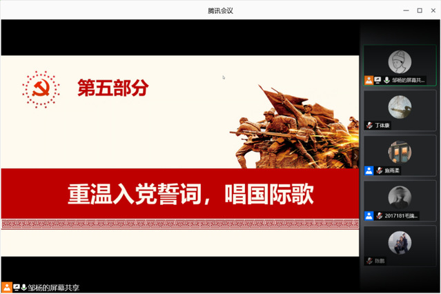 最后,支部书记陈鹏带领大家一起重温了入党誓词,并合唱《国际歌》,再次唤醒了大家心中的信仰和使命感。相信支部全体党员和发展对象一定会谨记本次会议的学习内容,加强“四史”学习和先进事迹的学习,积极投身到中国特色社会主义伟大实践中去,坚持理论联系实践,切实做到“坚守初心,勇担使命”。