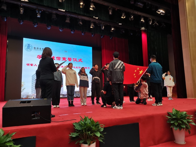 会议伴随着雄壮的国歌声拉开了帷幕。会议首先进行了学风诚信宣誓仪式,在学业辅导室学业活动中心主任胡晓艺和12名新生代表的领誓下,新生代表们庄重宣誓,立誓严守校纪、严于律己,建立诚信学风。随后,学院办公室副主任储超做新生教务工作指导、学院学风建设中心主任孙攀峰介绍了学业辅导室工作。