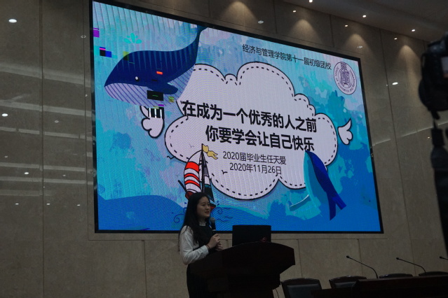 紧接着,任天爱向全体学员作“在成为一个优秀的人之前你要学会让自己快乐“主题宣讲。她根据自己近期工作后的亲身经历,向学员们说明了快乐的重要性,并从她的经历中反思得到以下几个观点:多鼓励多认可多赞扬,少批评少抱怨少骂人;友好对待身边每一个人;不要计较付出多回报少,或怕功劳被其他人抢去;从踏入社会开始,所有的荣光都清零,隐形的收获才是受益终身的;要正视错误,无惧失败,谁都会犯错,重要的你成长收获了什么,是否下次能有进步。任天爱也向学员们分享了快乐的秘诀之一:少抱怨,多沟通,学会沟通。同时她也说到,成功的定义是不同的,只要为自己的梦想坚持奋斗,你就是成功的。最后,任天爱希望各位学员都能勇敢追梦,努力成长,寻找自己的价值,成为一个快乐又温暖的人。