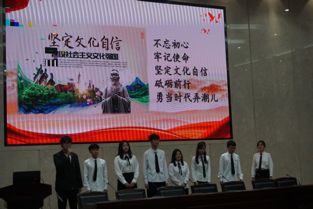 紧接在后,由第二小组作为优秀小组进行展示。在悠扬的音乐中,第二小组以“坚定文化自信,照亮人生前程”为主题,选取谈论中国从古至今的美德、文化、精神,强调每个人都应做到“不忘初心、牢记使命;坚定文化自信、砥砺前行;勇当时代弄潮儿”。