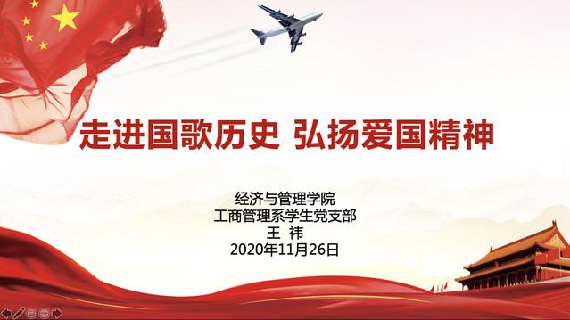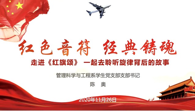 接下来,管理科学与工程系学生党支部书记陈奥以庆祝新中国成立70周年黄浦江光影秀视频引出“红色音符,经典传承”的主题党课,伴随着光影秀的背景音乐,大家一起欣赏《红旗颂》,聆听旋律背后的故事。《红旗颂》以宏伟庄严的旋律,表现了中国人民在红旗的指引下英勇顽强、奋发向上的革命气概,讴歌了伟大祖国蒸蒸日上的繁荣景象。陈奥老师以《红旗颂》创作的四个故事,启发同学们作为青年大学生,要勇于奋斗、实干担当,做到不忘初心、牢记使命,为实现中华民族伟大复兴的中国梦贡献自己的青年力量!