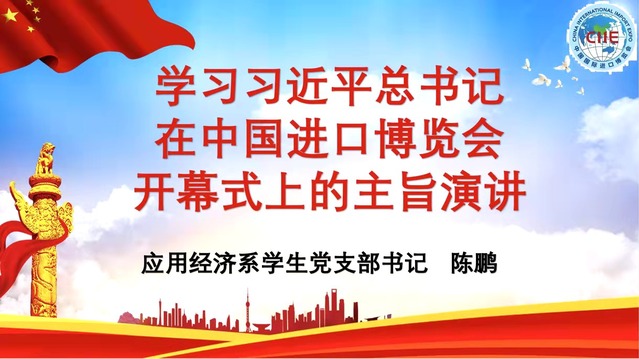 最后,应用经济系学生党支部书记陈鹏带领同学们一起学习了习近平总书记在中国进口博览会开幕式上的主旨演讲。陈鹏老师首先向同学们介绍了进博会的举办背景、展会标识、吉祥物、展馆展区等信息,然后带领大家着重学习了习近平总书记在第三届进口博览会上的主旨演讲,让大家理解了“新时代,共享未来”的深刻含义,进博会体现了安全、精彩、富有成效,中国同世界真诚地分享市场机遇、推动世界经济复苏,展现了后疫情时代的大国担当。也展现了伟大的祖国正同世界各国一道,在开放中创造机遇,在合作中破解难题,携手创造人类更美好的明天。