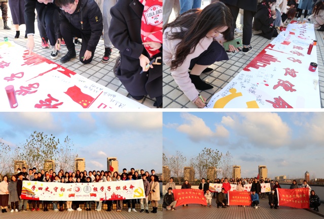 绘纪念画卷,守“四史”初心。所有成员来到经外楼三楼露天平台,为定制的蕴含“四史”元素的横幅画布填色,并签名留念。全体师生党员共绘“四史”画卷,同谱绚丽篇章,大家一点点将白色画布绘制为七彩的画卷,在临港校区的澄澈天空下留下了对崇高理想的热爱与追求的印记。