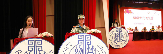 在校生代表院学生会执行主席顾婷婷,用自身的经历为新生提供了大学四年的奋斗目标,并提出要学会懂得取舍的宝贵经验;留学生代表莎伟表达了对中国及汉语文化及所学专业的热爱;新生代表沈娟,说出了全体新生对于大学生活的期待与向往,同时制定目标,分享在今后学习生活中不断提升自己,自强不息的信念。