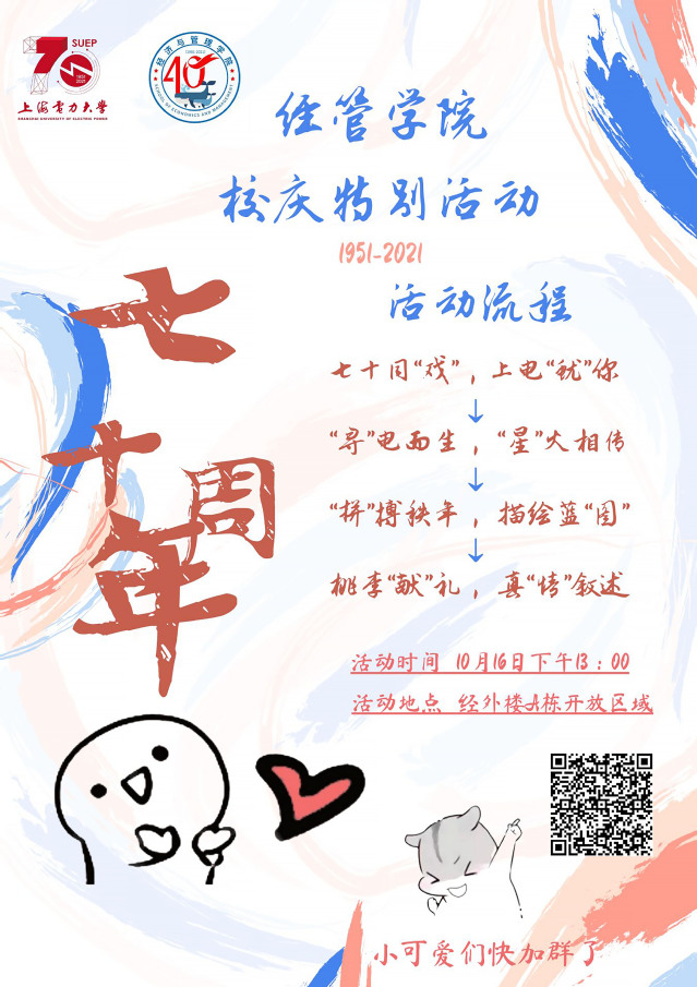 七秩盛世谱华章,砥砺同心意图强。2021年10月16日,英国上市公司官网365迎来70周年校庆,为凝聚师生人心,助推学院建设,促进学校发展,英国上市公司官网365于经外楼A栋可开放区域开展了七十周年校庆嘉年华特别活动。