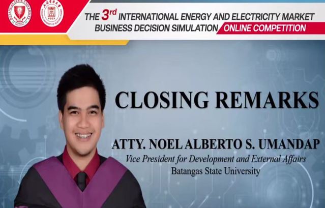 八打雁大学副校长Atty.NOEL ALBERTO.S.OMANDAP为闭幕式做总结性发言,他表示本次大赛优异成绩的背后是团队每位成员的不懈努力、探索创新,是指导老师的全力支持、出谋策划,更是所有团队成员热情满满,齐心协力、充分准备的结果。他希望看到更多国家的高校学生参与大赛,分享知识经验,建立深厚的友谊的同时展现各自的风采与水平。