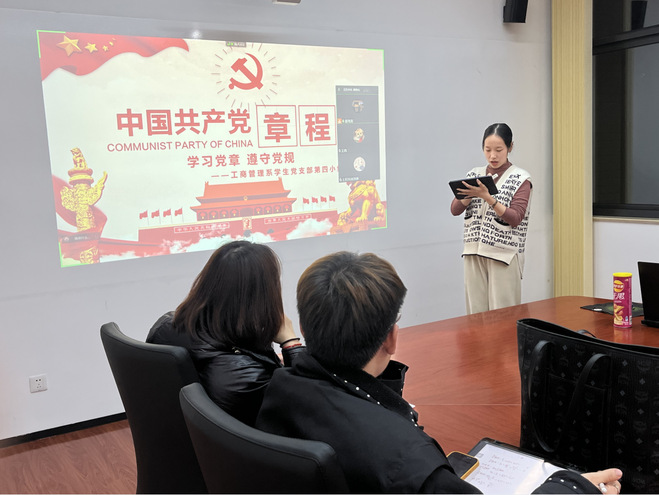 李明璇同志,讲解了《中国共产党支部工作条例(试行)》。她在领学时着重讲解了党支部组织生活的要求,并且从工商管理系学生党支部自身出发,告诫大家要认真对待每一次的组织生活会,积极开展批评和自我批评,不断提高自身素质。