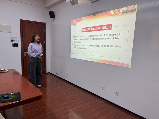 顾婷婷同志结合PPT和视频,讲解《中国共产党党章》相关内容,带领党支部成员学习党章的制定历程、总纲、条文等。向党支部成员传达出,党章就是党的根本大法,是全党必须遵循的总规矩。在各项活动中都要自觉学习党章、遵守党章、贯彻党章、维护党章。