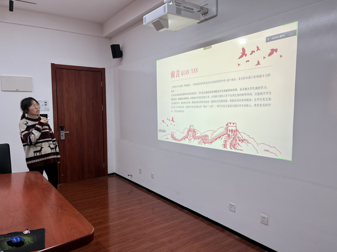 庄典同志,讲解了《关于加强新形势下高校学生党支部建设的意见》。她指出:作为高校党的基层组织的重要组成部分,学生党支部是党密切联系学生的桥梁和纽带,是引领大学生刻苦学习、团结进步、健康成长的阵地。因此,加强新时代高校党建工作,必须树立党的工作下沉到支部的鲜明导向,全面提升学生党支部组织力,强化政治引领。