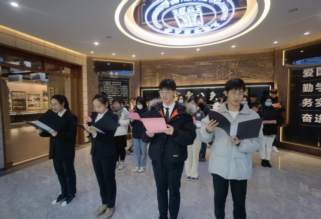 交流环节后,2019062全体团员们来到校史馆,以青春的声音,激昂的热情,共同朗诵共同朗诵《青春宣言》,并许下最美誓言——强国有我,奋斗有我。