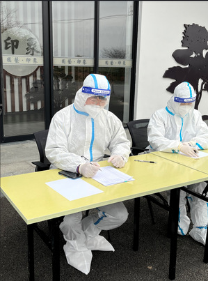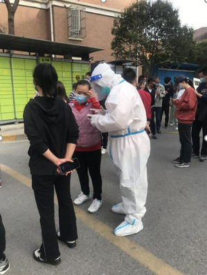 除了校内争当志愿者,在社区的同学也在为这场战“疫”贡献自己的力量。大四学生马灵敏,家在闵行区虹桥镇,她所在的社区于3月18日进行封闭管理,她主动联系社区成为了一名疫情防控志愿者。在社区开展核酸检测的时候,她身穿防护服,在核酸检测点登记所有在住人员信息,一一核对核酸检测人员名单,在齐心协力的努力下,社区居民全员完成四次核酸检测。公共事业管理专业大四学生陈嵘,在听闻小区需要封闭管理做核酸时,义无反顾地报名加入了抗疫志愿者队伍,为疫情防控献出青年学子的力量。穿上分配到的防护服,化身大白,他成为了社区志愿者,按序通知各个楼道的居民下楼,并引领他们前往核酸检测点,帮助不会使用手机的老年人们申请登记码……在不懈的努力下,核酸检测顺利完成。