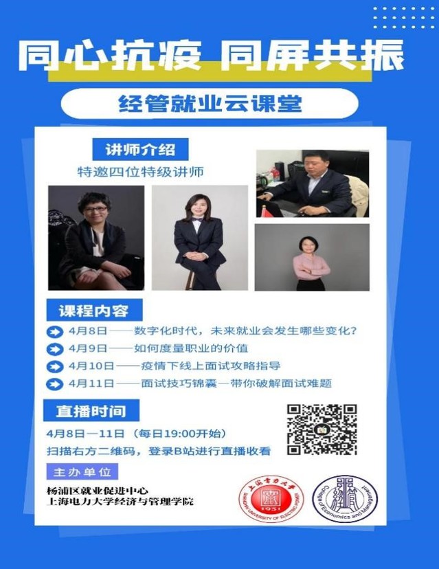 为进一步做好“稳就业”、“保就业”工作,努力提升疫情期间就业指导和服务质量,做好疫情防控和毕业生就业工作“两不误”。英国上市公司官网365联合杨浦区就业促进中心开展了“同“心”抗疫,同“屏”共振---就业云课堂”线上系列活动。就业云课堂4月8日至11日连续四晚19:00点在B站进行线上直播,特邀四位就业专家帮助毕业生解决就业疑难,应对就业难关。