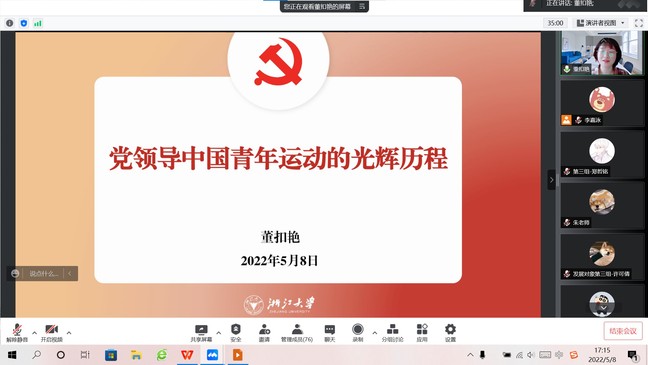 随后浙江大学马克思主义学院优秀青年教师董扣艳为同学们带来了《党领导中国青年运动的光辉历程》专题讲座,董老师旁征博引,从党在革命历史时期,社会主义建设和改造时期,改革开放发展时期以及新时代党对青年的关心关怀为出发点,清晰的描述了党在不同历史时期带领和依靠广大青年克服困难,勇往直前在实现中华民族伟大复兴的道路上取得的光辉成绩。讲座中董老师对“内卷”、“躺平”、“丧”文化的进行了仔细剖析和深入分析,她号召同学们一定要树立远大理想,立大志,做大事,到新时代,新天地,到人民群众中去让青春在创新创造中闪光!本场演讲取得了良好的效果,同学们纷纷表示董老师从不同的视角和站位生动了解答同学们平时在生活和学习中的困惑,为自己的入党之路进一步指明了方向。