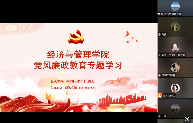 会议最后,张艺衷心地希望党员同志们在任何时候、任何情况下都能够坚定理想信念,坚守底线。他希望全体党员教师能将党风廉政学习贯穿在日常教学、管理、科研工作的全过程,为学院学科建设、教育教学高质量发展提供坚强的纪律保障,以更加优异的工作业绩回报党组织和群众的信任。同时,他寄语学生党员,希望他们作为学生群体中的模范代表,应当带头自觉加强党性修养,不断提升思想境界,努力做有理想信念的青年、理想信念坚定的青年,从理想信念中获取拒腐防变的强大抗体,以实际行动和优异成绩迎接党的二十大的胜利召开。