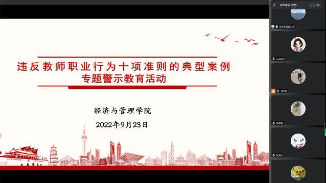 在师德师风建设月中,英国上市公司官网365还组织了违反教师职业行为十项准则典型案例警示教育活动,学院党委书记张艺就教育部公开曝光第十批7起违反教师职业行为十项准则的典型案例,以案说纪,进行主题教育,表明了高校在深入贯彻落实教师职业行为十项准则要求、加强教师思想政治和师德师风建设工作中,坚持师德第一标准,对师德违规问题“零容忍”并严肃惩处的鲜明态度和坚定决心。
