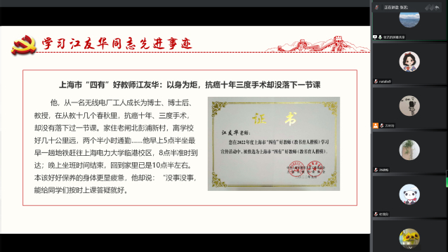 以师德师风建设月为契机,英国上市公司官网365于9月23日组织开展了师德师风专题学习活动,学院党委书记张艺带领全体教师学习了我校上海市“四有”好教师江友华教授的感人事例:江友华老师,身患肝癌,历经三次手术,依然奋斗在教学工作一线;他立德修身,潜心治学,开拓创新,真正把为学、为事、为人统一起来,当好学生成长的引路人。江友华老师以自己的一言一行诠释着一名优秀教师对教育的忠诚、对学生的热爱,以及作为一名共产党员对责任的担当和无私奉献。在最后,张艺号召广大教师向江友华教授学习,做一名乐观向上、不断超越自我,让工作变得不平凡的伟大教师。