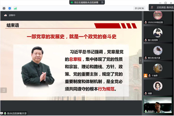 国网上海电力公司党校陈永忠老师本次党校教授第一讲——《党章的诞生与变迁》。党章是管党治党的总章程、总规矩,是中国共产党最根本的党内法规。而党章的发展史,就是中国共产党的奋斗史。陈永忠老师通过生动的党史故事,向大家介绍了党章由谁起草、起初由谁保存、以哪一部文献为依据等三个基本问题。在介绍十九部党章的变迁时,陈永忠老师通过对比以往党章和现有党章,讲述了党各个阶段修改党章的历史背景和现实依据,阐明了中国共产党在实践中不断提升自我并加强理论创新,一步步带领中国人民走向繁荣富裕。陈永忠老师号召学员们坚定理想信念,对党忠诚、服务人民,树立清正风气,勇于担当作为,向合格的共产党员看齐。