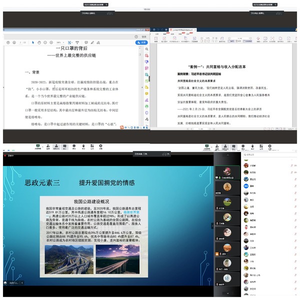 戴秦、崔树银和王倩雅老师以实际的课堂教学内容为例,展现了将枯燥的理论知识和计算公式与“接地气”的时政生活热点相结合,巧妙地将价值引领与知识传授相融通,从而使得学生在学会专业知识的同时,也接受了思想精神指导。葛静燕、王燕和蔡依平老师列举和总结了自己专业课程中所融入思政元素,他们指出,一定要注重对爱国拥党、道路自信和文化自信等元素的选取、运用和融合,真正发挥专业课程教育的教书育人作用。