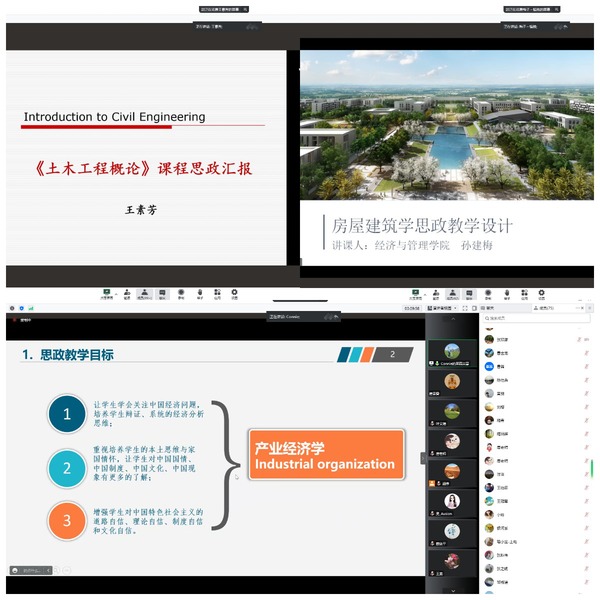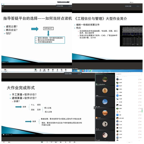 由于疫情防控需要,实践类的专业课程也由线下转移到了线上“阵地”进行教学。张双甜老师以其主讲的《工程估价与管理大型作业》课程为例,向与会教师分享了在线上进行相对复杂的专业实践课程,并将课程思政融入其中的经验心得。张老师介绍,《工程估价与管理大型作业》是一门包含了算量、建模和计价的实践课程。张老师多措并举,在课前找出难点、及时补充专业知识材料,在课中多平台分工、强化思政引导,在课后实时在线充当“点读机”,通过将诚实守信,精益求精的“工匠精神”贯穿专业实践课程始终的方法,引导学生在计算和建模中学习和领会中国精神,做到了线上课程和线下课程的等质同效,受到了学生们的好评。