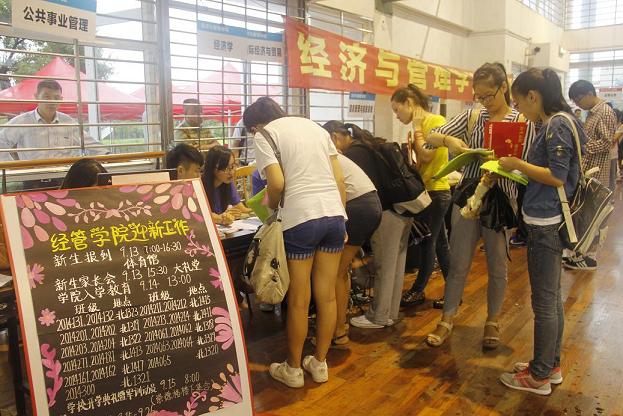 在迎新会场,新生在各自专业前注册登记,秩序井然。为保证家庭经济困难学生能够顺利入学,学校继续实施绿色通道,帮助困难学生解决实际困难,尽快适应大学生活。